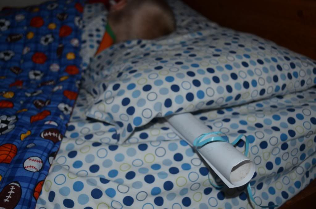 In the morning after their snuggle time in bed with mommy we all ran out to the living room to see what the Easter bunny had put in their baskets that they left out but the baskets were missing. We told the kiddos that we have heard that sometimes he leaves a note by their bed. So they all ran to their rooms and found their first scroll.